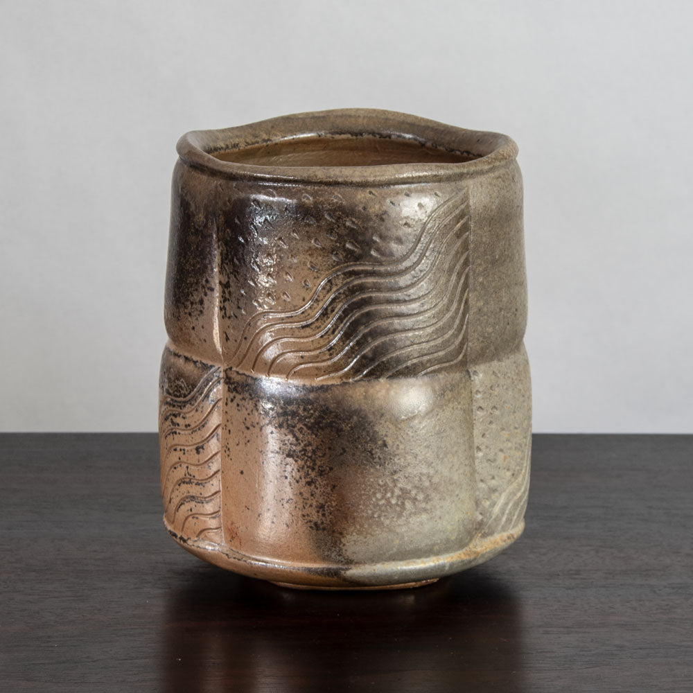 2. Unique stoneware double gourd vase with matte brown glaze and incised decoration. Dated 1988.