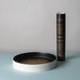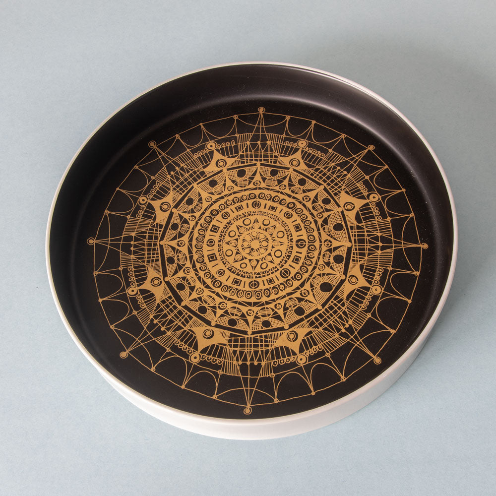 Porcelain bowl with glossy white glaze to exterior, matte black and gold decoration to interior, 1960s.