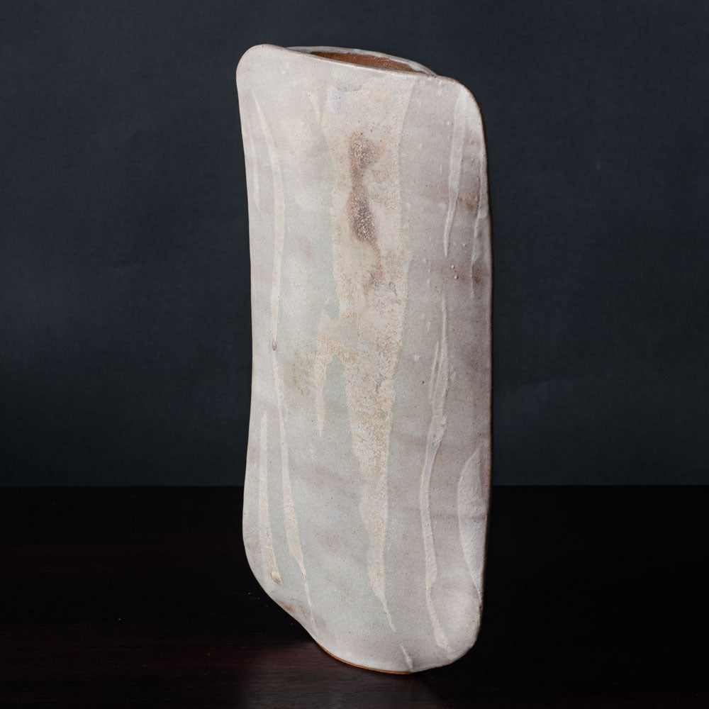 Unique stoneware sculptural vessel with matte buff colored glaze, c. 1980s.