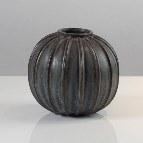 Arne Bang, Denmark, blue and brown ribbed vase K2735