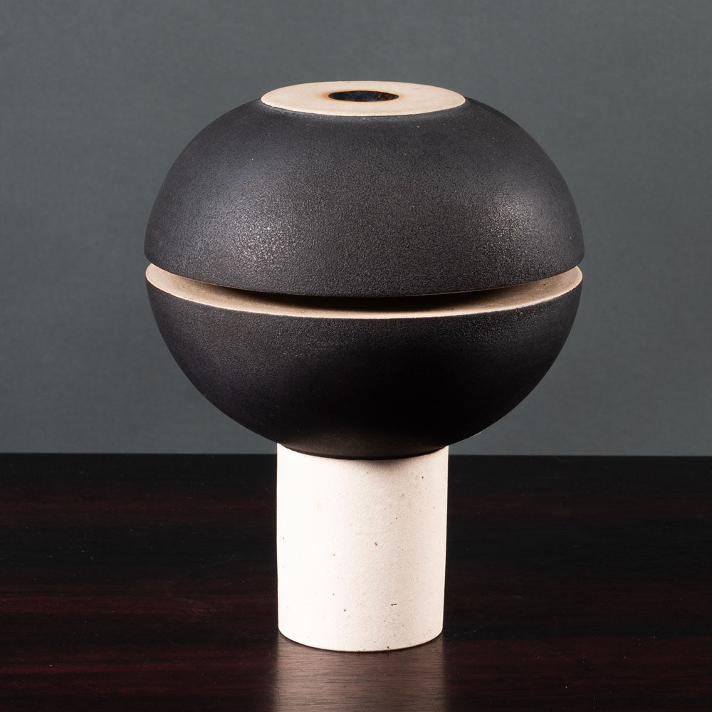 Stoneware sculptural form with matte black glaze and cream colored unglazed areas, 1981.
