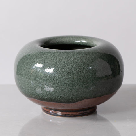 Horst Kerstan, Germany, unique round vase with glossy green crackle glaze H1517