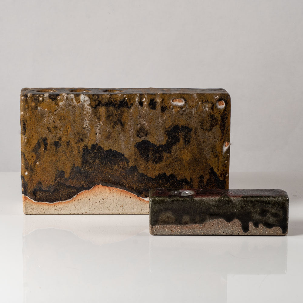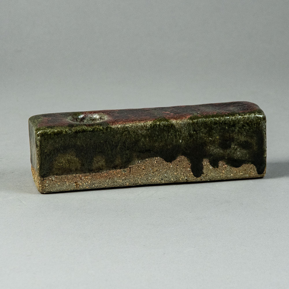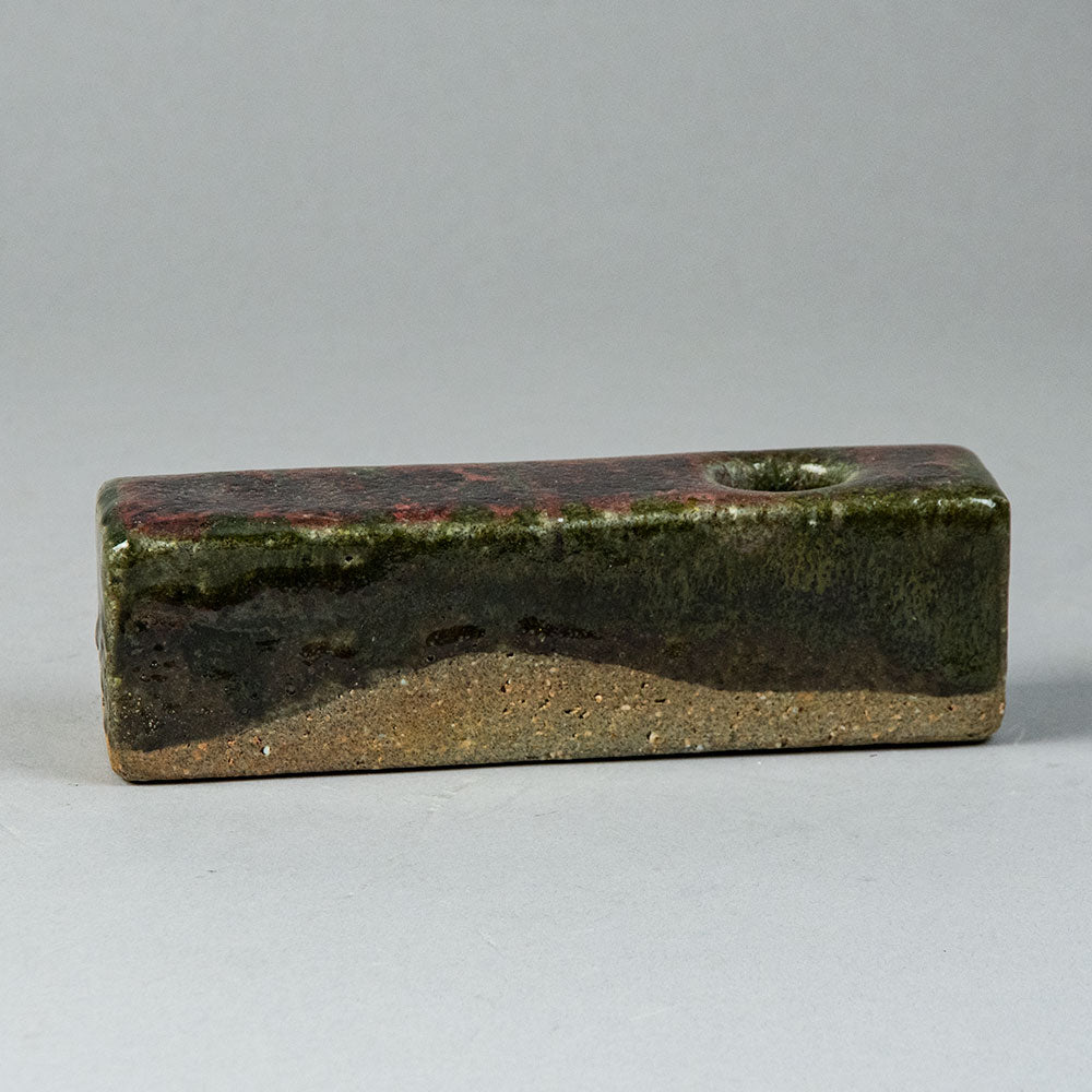 2. Unique stoneware rectangular sculptural vase with glossy olive and red glaze.
