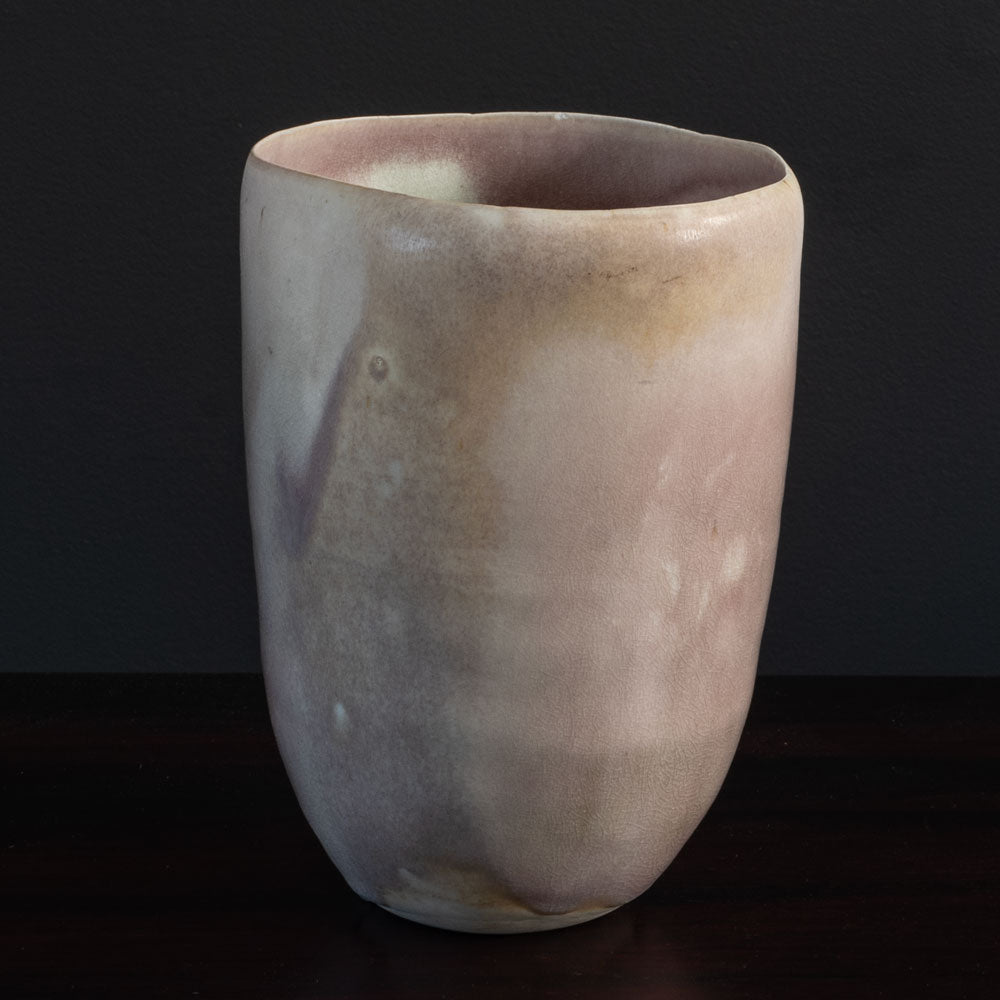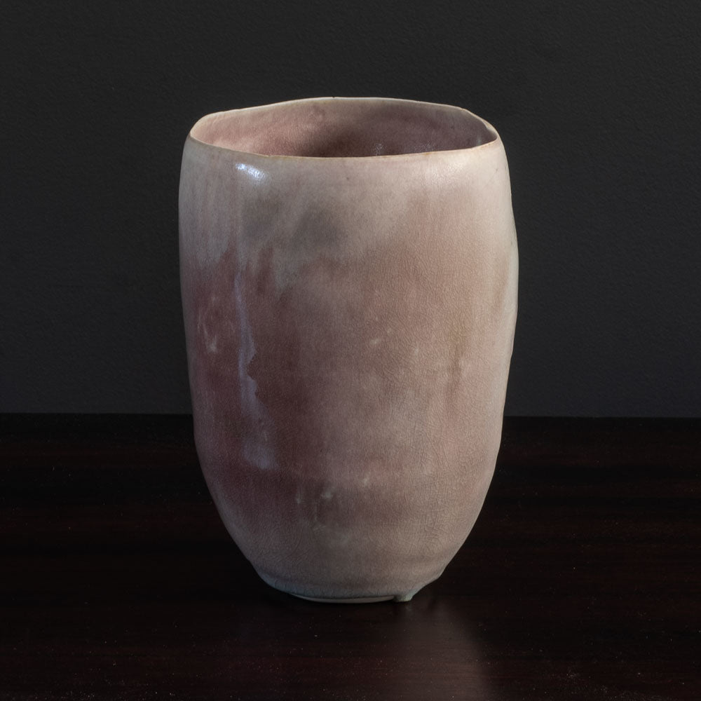 Unique porcelain sculptural vase with layered concentric circular ridges to interior. Pink and off-white glossy crackle glaze.