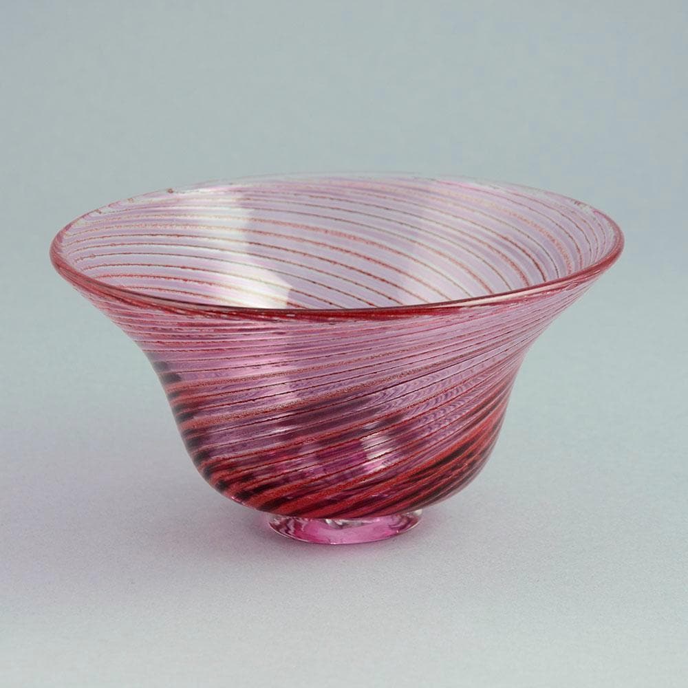 "Aqua graal" footed bowl internally decorated with lines of pink ground glass.