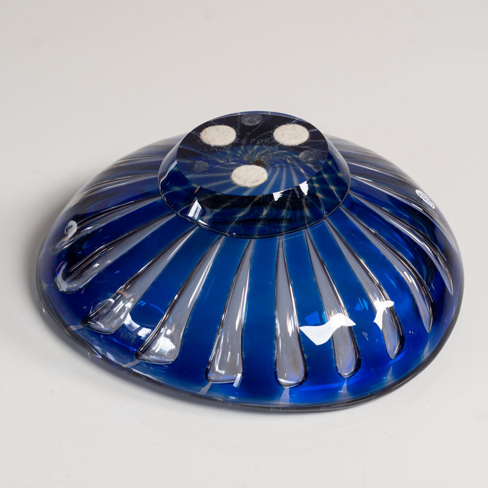 "Ariel" bowl in amber and blue glass with pattern of vertical lines, 1949.