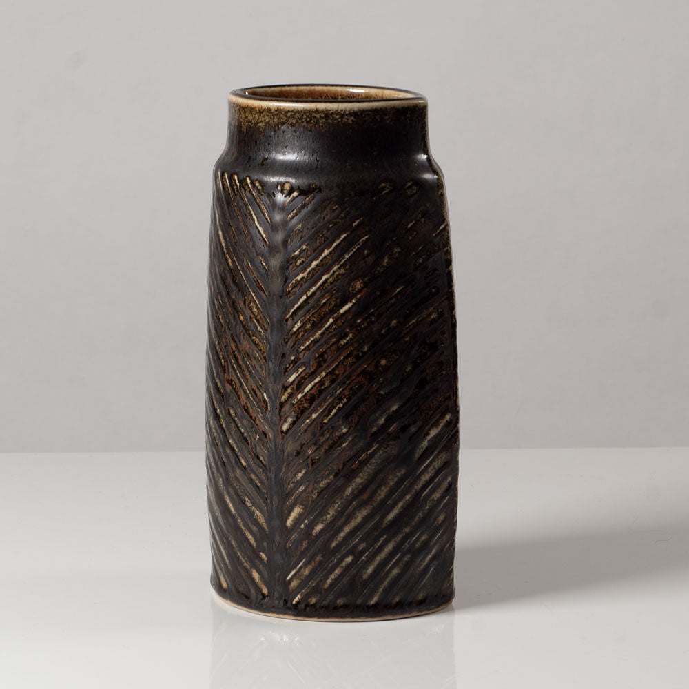 Unique stoneware vase with incised pattern and semi-gloss brown glaze, 1960s.
